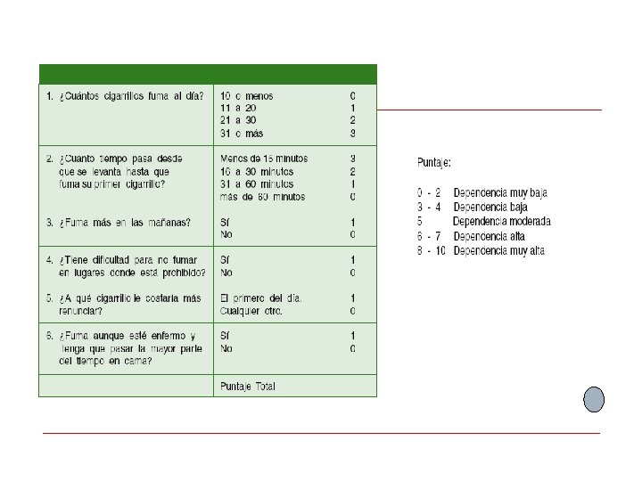 ¿En qué consiste? Averiguar ¿Cuál es el grado de adicción? -Test de Fagërstrom ¿Por qué fuma? Test ¿Por qué fuma Ud. ? ¿Por qué no se atreve a intentar dejar de fumar? Obstaculos y resistencias para dejar de fumar Aconsejar Reforzar la decisión correcta: Dejar de fumar Ayudar Acordar Acompañar Negociar Día D y suscribir contrato Crear redes de apoyo El proceso de dejar de fumar - Analizar intentos anteriores -Enfrentar inquietudes personal y analizar estrategias o prescribir terapias farmacológicas de apoyo a la cesación en personas con alto grado de motivación y adicción. -La literatura recomienda tratamiento farmacológico a todos los pacientes que están tratando de dejar de fumar; sin embargo, ajustado a la realidad local, sólo se indica quienes evidencien un alto grado de motivación y que hayan tenido un intento de abandono fallido durante los últimos 12 meses con una puntuación de Test de Fagërstrom de más de 8 puntos -Derivar, según corresponda, a los pacientes que requieren solucionar otras patologías previas a una intervención de cesación. -Complementar con grupos de cesación o intervenciones individuales de otros miembros del equipo