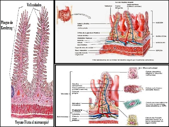 Definiciones • Digestión: Mecanismo de degradación de alimentos en moléculas de tamaño reducido. • Degradación de: Carbohidratos, proteínas y lipidos. • Por: enzimas salivales, jugo gástrico, pancreático y cels. de las vellosidades intestinales. • Absorción: Transferencia de sustancias (productos finales de la digestión) a través de la pared intestinal hacia la sangre. • Principal sitio de absorción: intestino delgado