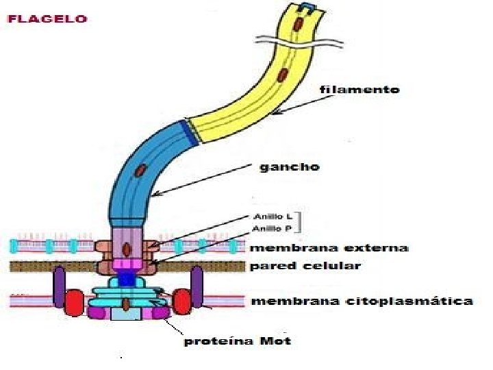 FLAGELOS § Son largos apéndices filamentosos extracelulares, helicoidal, hueco, que se fijan a la célula por uno de sus extremo y el otro se encuentra libre, longitud de 10 a 20 nm. § Ejemplos: Escherichia coli es de 20 nm Función: § Confiere movilidad a la célula. § Permiten a la célula bacteriana, moverse, o trasladarse a lo largo de superficies sólidas. § Se desplaza a 0. 00017 Km. /h § Presentes en bacterias Gram + y Gram-, con frecuencia en bacilos y muy raro en cocos. § Composición: proteína llamada flagelina, SUSTANCIA que confiere propiedades antigénicas, (antígeno H ).
