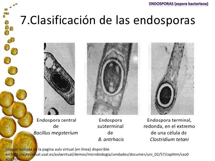 TIPOS DE ENDOSPORAS A. Terminal B. Subterminal C. Central. TIEMPO DE VIDA DE UNA ESPORA: Indefinido, hasta que las condiciones del medio sean favorables (Clostridium aceticum --- 30 años) COLORACION DE LA ENDOSPORA: Verde malaquita, Eosina o safranina