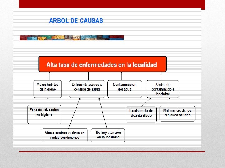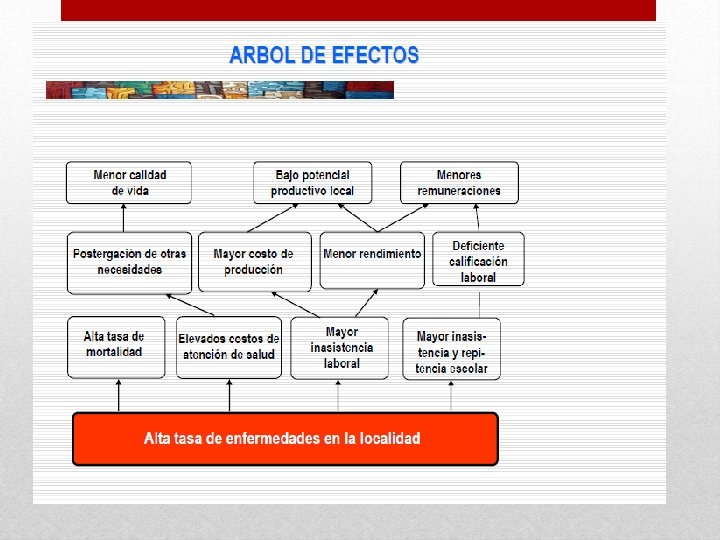 Análisis de Problemas Pasos para Realizar un Árbol de Problemas 1 Identificamos todos los problemas existentes (en estado negativo) mediante una lluvia de ideas. 2 Priorizamos, tratando de determinar el problema que parece más significativo y afecta en mayor medida a los grupos de potenciales beneficiarios. Éste será el problema focal o central. 3 Una vez identificado el problema central, los demás (problemas) se organizan en un diagrama con forma de árbol como causas y efectos de este problema central. Para ello, se colocan las causas principales y directas debajo del problema central y los efectos directos, encima del problema central.