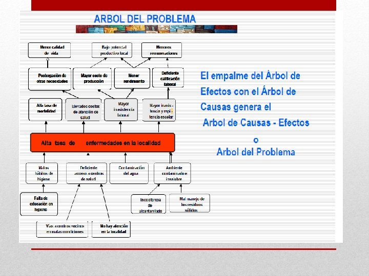 Análisis de Problemas METODOLOGÍAS DE ELABORACIÓN DE ÁRBOLES En este punto utilizaremos las técnicas de árboles como herramienta para identificar adecuadamente un problema y buscarle la mejor solución. 1. 2. 3. 4. 5. 6. 7. Definición del problema central Determinación de efectos Identificación de causas Definición de objetivos Exploración de acciones Planteamiento de alternativas Selección de alternativa óptima