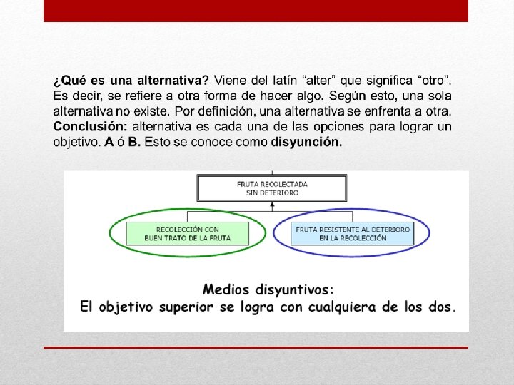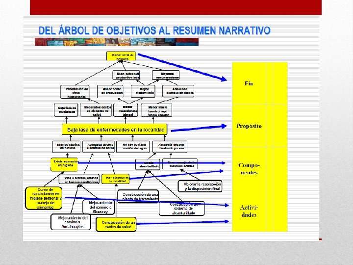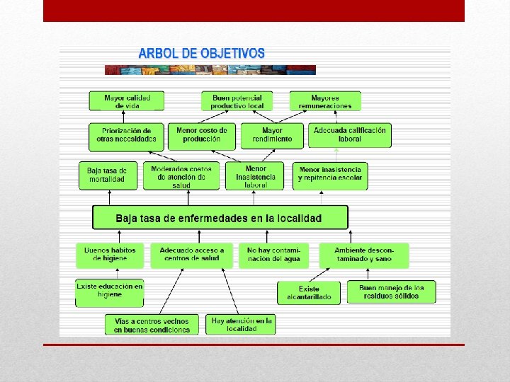 Análisis de Objetivos Pasos para Realizar un Árbol de Objetivos 1 Transcribimos los estados negativos que refleja el árbol de problemas en condiciones deseables positivas. 2 El problema focal del árbol de problemas se convierte automáticamente en el objetivo principal o central del árbol. 3 Revisamos todos los cambios realizados que resultan, para asegurarnos de la validez del árbol de objetivos planteado, es decir verificamos la lógica-medios-fin.