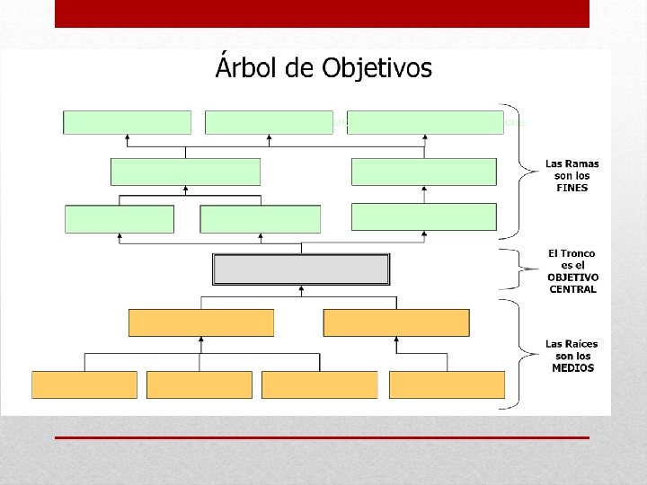 Herramientas de identificación de un proyecto: el análisis de objetivos • Los problemas identificados y diagramados se transforman en objetivos o soluciones a dichos problemas, como paso inicial para identificar la situación futura deseada, es decir para identificar un proyecto. El Análisis de Objetivos es útil para: • Describir una situación que podrá existir después de resolver los problemas. • Identificar las relaciones de tipo medio – fin entre objetivos. • Visualizar esas relaciones medio – fin en un diagrama. • Árbol de Objetivos. Presenta las relaciones de medios a fines.