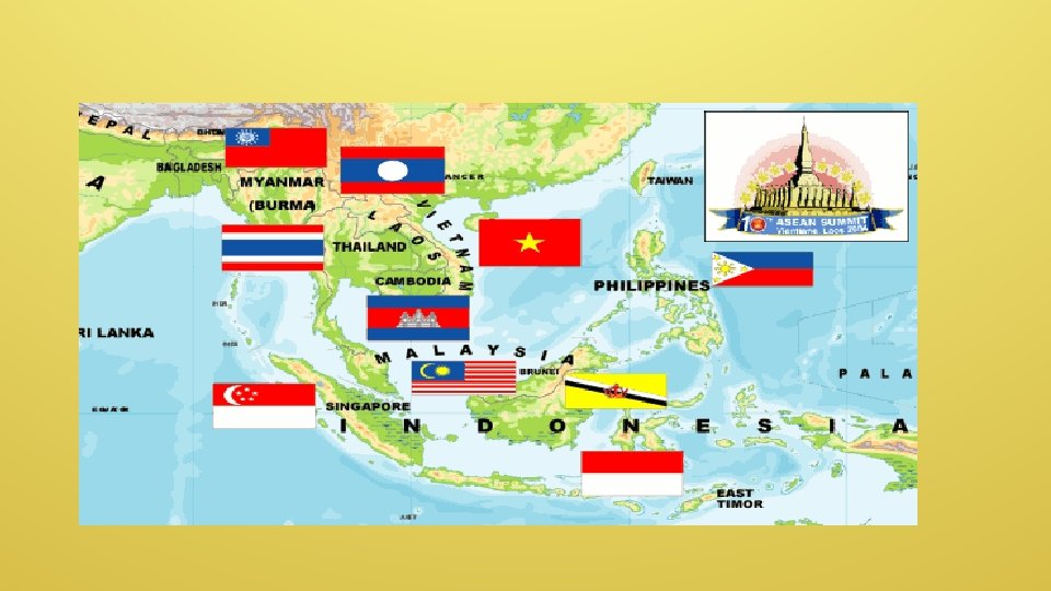 Asociación de Naciones del Sudeste Asiático (ASEAN) 1967 Fundada en Bangkok : Indonesia, Malasia, Filipinas, Singapur y Tailandia Declaración de Bangkok 1992 Brunei Darusalam, 1995 Vietnam 1997 Laos, Camboya y Myanmar Primera reunión cumbre Balí 1976 Tratado de Amistad y Cooperación en el Sudeste Asiático y la Declaración de concordia Garantizar la paz y seguridad de la región y fortalecer la cooperación con otros países