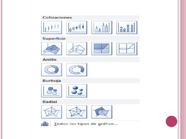 Gráficos circulares. También conocidos como gráficos de pie (en inglés) o gráficos de pastel. Estos gráficos pueden contener una sola serie de datos ya que muestran los porcentajes de cada una de las partes respecto al total.