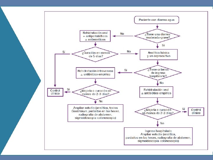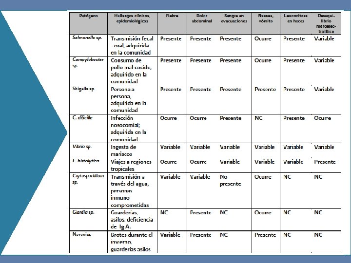 CUADRO CLINICO Episodio diarreico: “es el que cumple el criterio anterior y termina cuando el último día con diarrea es seguido con al menos 48 horas con deposiciones normales”. • Causada por agentes que invaden la mucosa intestinal. • Se acompaña de un estado toxico infeccioso (Fiebre, taqui o bradicardia, hipotensión, dolor abdominal) • Causada por microorganismos productores de toxinas • Autolimitada y tiene una duración menor a 3 días Santolaria Piedrafita, S. , Cortés, L. Diarrea aguda de etiología infecciosa, en: Montoro Huguet, M. , Gracía Pagán, J. C. (Coords) Manual de emergencia en Gastroenterología y Hepatología, 2010