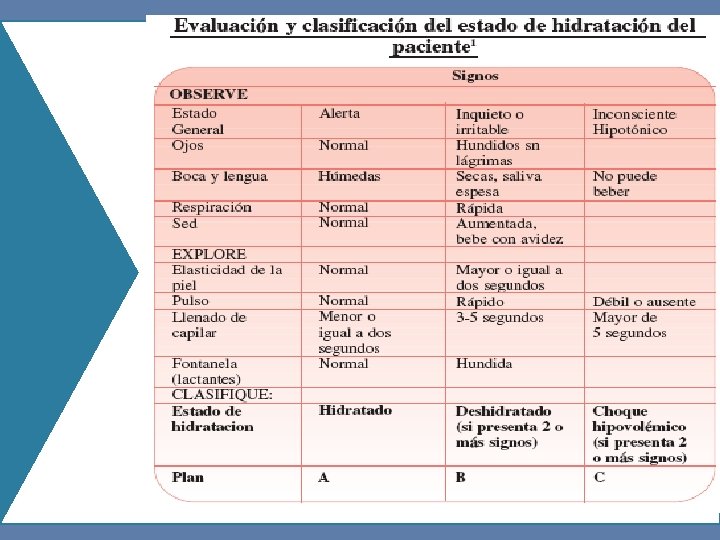 PLAN C • 25 ml / kg /hr. en 3 cargas Hartmann Sol Fisiológica • Primera Hora 50 ml/kg/hr. • Segunda Hora 25 ml/kg/hr • Tercera Hora 25 mlkghr • Al poder beber: suero oral 25 m. L/kg/hora Retirar venoclisis. • • Episodio diarreico: “es el que cumple el criterio anterior y termina cuando el último día con diarrea es seguido con al menos 48 horas con deposiciones normales”. • Terminar de hidratar por vía oral