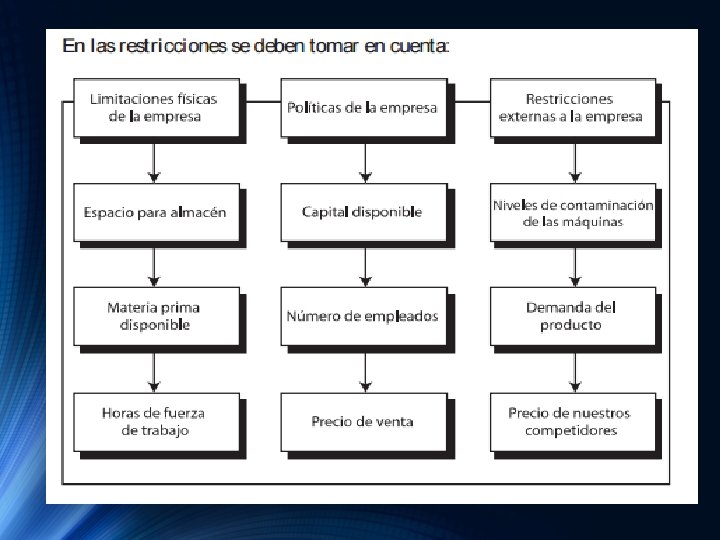 Plantear las restricciones del problema Las restricciones son relaciones matemáticas entre las variables de decisión y las limitantes de la empresa. En el caso de los modelos de P. L. estas restricciones son desigualdades o igualdades lineales. Estas inecuaciones matemáticas incluyen restricciones lógicas para las variables que las condicionan a ser siempre positivas. A estas restricciones que se presentan al final del modelo les llamaremos condiciones de no negatividad