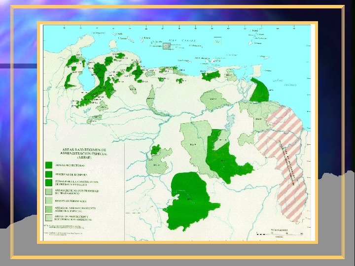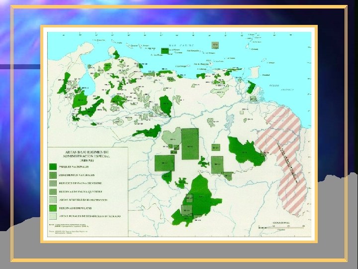 Debilidades del conjunto de ABRAE n Sobreposición parcial o total de algunas ABRAE, incluso entre figuras no necesariamente compatibles n Diseño inapropiado de linderos n Uso inapropiado de algunas figuras con respecto al fin de conservación y manejo deseado n Incongruencias o contradicciones entre las actividades y usos permitidos en ciertas ABRAE n Existencia de algunas ABRAE innecesarias, al tiempo que existe parte del patrimonio natural sin ninguna figura de protección FUENTE: MARNR. 1985.