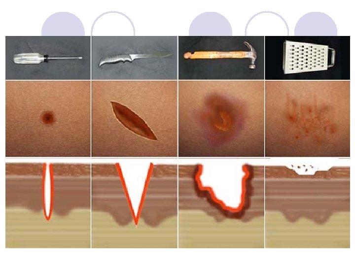 Características de la lesión Forma El objeto causante Tamaño Ubicación Bordes Trayecto Número Pronóstico Información sobre La dirección de la agresión El grado de energía ‘la intencionalidad’