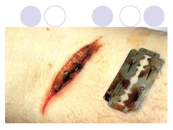 Cortante • Producidas por objetos con extremos filosos como latas, vidrios, cuchillos. • Pueden seccionar músculos, tendones y nervios. • Los bordes de la herida son limpios y lineales, la cantidad del sangrado depende del lugar y la cantidad de los vasos sanguíneos lesionados.