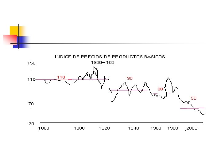 Las materias primas tienden a la baja n n n Los precios de las materias primas se usan como colchón para amortiguar la baja rentabilidad de la inversión en la fase decadente del ciclo largo. El recurso petrolero se usó para fomentar el auge de la 4° Revolución tecnológica o 3° ONDA LARGA DEL CAPITALISMO. El petróleo también sirvió de detonante de la gran crisis del modelo fordistakeynesiano en 1973.