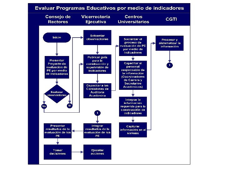 Utilidad del sistema de indicadores: Identificar las minorías de características vitales de los PE para reducir los problemas más significativos (Regla 80/20). Tomar decisiones educativos. para cerrar brechas entre programas Generar buenas prácticas institucionales para el Diseño, Planeación y Ejecución de políticas académicas. Obtener de manera actualizada y permanente una visión comparada entre PE de un CU e intercentros. Aportar elementos para diseñar planes de mejora y establecer proyecciones institucionales y evaluar los PE.