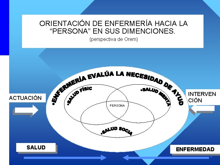 ORIENTACIÓN DE ENFERMERÍA HACIA LA “PERSONA” EN SUS DIMENCIONES. (perspectiva de Orem) INTERVEN CIÓN ACTUACIÓN PERSONA SALUD ENFERMEDAD 5