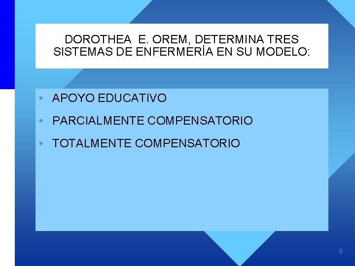 El sistema de enfermería • Representa las acciones e interpretaciones de la enfermera y el paciente en los componentes sociales, interpersonales y tecnológicos, determinando un rol específico: • De lo que la enfermera hará. • De lo que el paciente y la enfermera harán juntos. 8