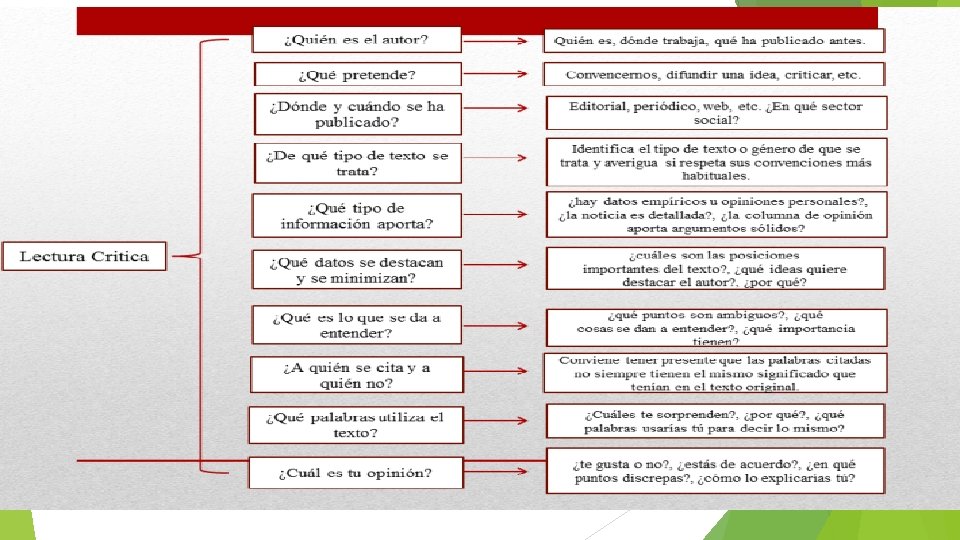 El concepto de lectura crítica hace referencia a la técnica o el proceso que permite descubrir las ideas y la información que subyacen dentro de un texto escrito. Esto requiere de una lectura analítica, reflexiva y activa. La lectura crítica, por lo tanto, es el paso previo al desarrollo de un pensamiento crítico. Sólo al comprender un texto en su totalidad, desentramando el mensaje implícito del contenido más allá de lo literal, es posible evaluar sus aseveraciones y formarse un juicio con fundamento. http: //leamoscriticamente. blogspot. com/2014/03/en-la-actualidaddebemos-enlas-actuales. html