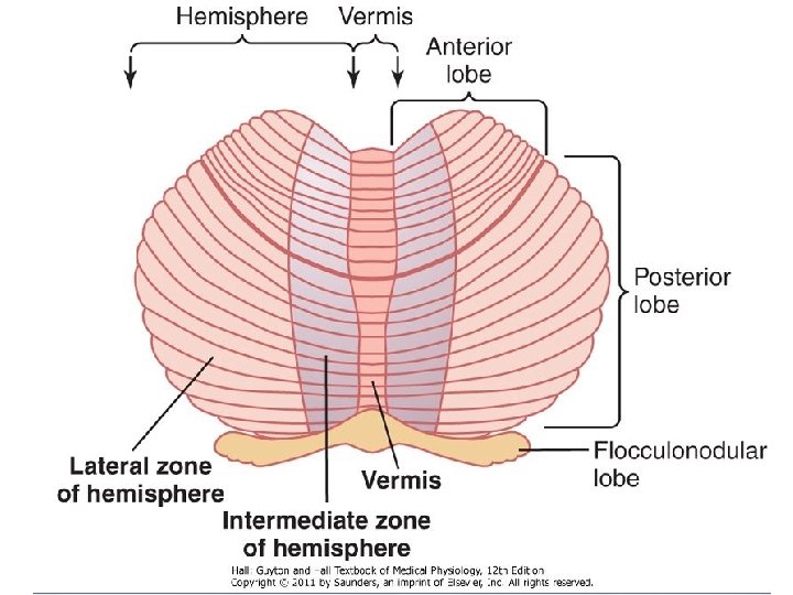 2. Circuito neuronal del cerebelo Las tres regiones funcionales del cerebelo tienen diferentes centros de entrada y de salida Kandel y colaboradores, Principios de Neurociencias. 4 ta edicion 2000