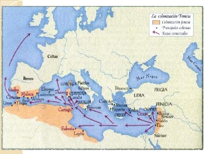 �A pesar de que la fama de � LOS FENICIOS proviene fundamentalmente de sus actividades comerciales y colonizadoras a través de sus viajes marítimos, también se destacaron en estas actividades por tierra, mediante el tráfico de caravanas de ? Estas extensas filas de animales cargados de preciosas mercancías HACIA ORIENTE por las rutas de Armenia y hacia el ÁFRICA atravesando el desierto del Sahara desde la colonia de Cartago.