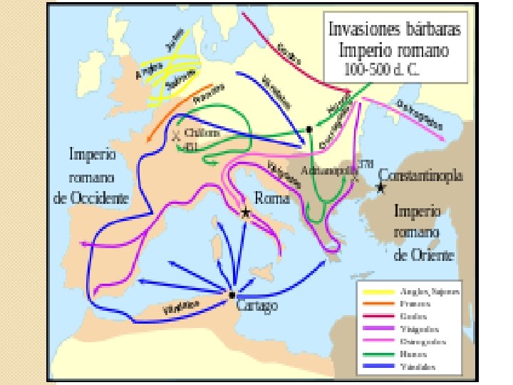 Unos años más tarde, tras la muerte del emperador Teodosio en el año 395 d. C. , el imperio quedó dividido entre sus dos hijos, Arcadio y Honorio. Uno recibió LA PARTE OCCIDENTAL, con Roma como capital el otro LA PARTE ORIENTAL con Constantinopla como metrópolis. La división sería definitiva. El Imperio Romano de Occidente dejó de existir en el año 476, cuando cayó bajo el dominio de los germanos. El imperio Bizantino de Oriente duró otros mil años más, hasta que en el año 1453, Constantinopla fue conquistada por los turcos musulmanes.