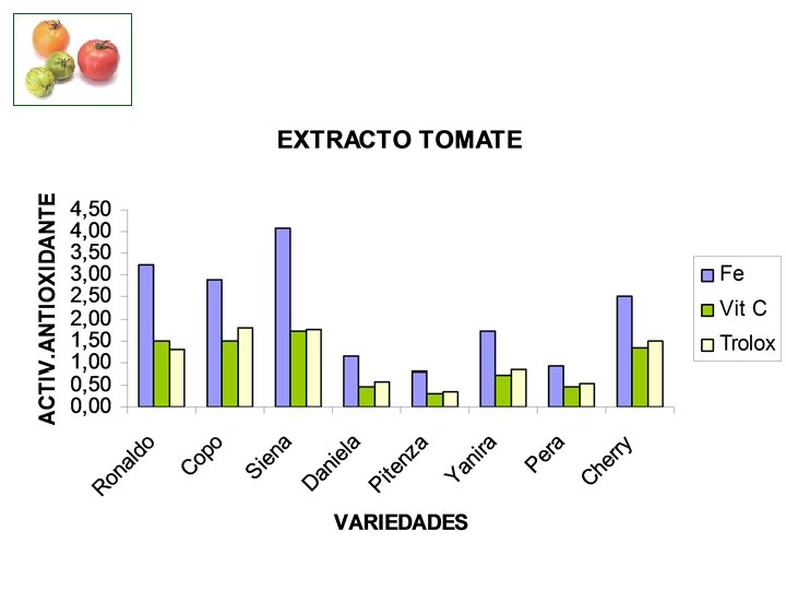 VARIEDAD COLOR LICOPENO FENOLES 5 -MTHF YANIRA Maduro 4. 98 279. 37 16. 58 YANIRA Inmaduro 1. 66 163. 46 21. 58 PITENZA Maduro 6. 05 104. 44 21. 17 PITENZA Inmaduro 2. 25 82. 64 26. 24 CHERRY Maduro 13. 55 239. 96 15. 43 CHERRY Inmaduro 5. 30 244. 26 19. 11 RDA 400 microgramos ~ 250 gr de tomate (15% RDA)