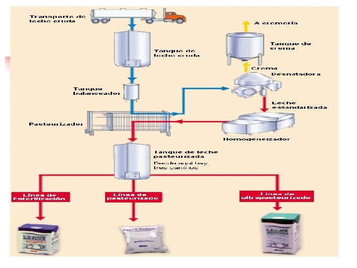 LECHES DE CONSUMO. PASOS Y/O PROCESOS PREVIOS: -Clarificación: Consiste en la eliminación de partículas insolubles, se realiza por centrifugación (células somáticas, partículas del suelo, paja, estiércol, etc. ) -Estandarización: Ajuste del contenido en materia grasa, normalmente por centrifugación. Norma COVENIN 3, 2 %. -Homogeneización: Reducir y ajustar el tamaño de los glóbulos de grasa desde 1 -18 µm a 1 -2 µm (ventajas y desventajas)