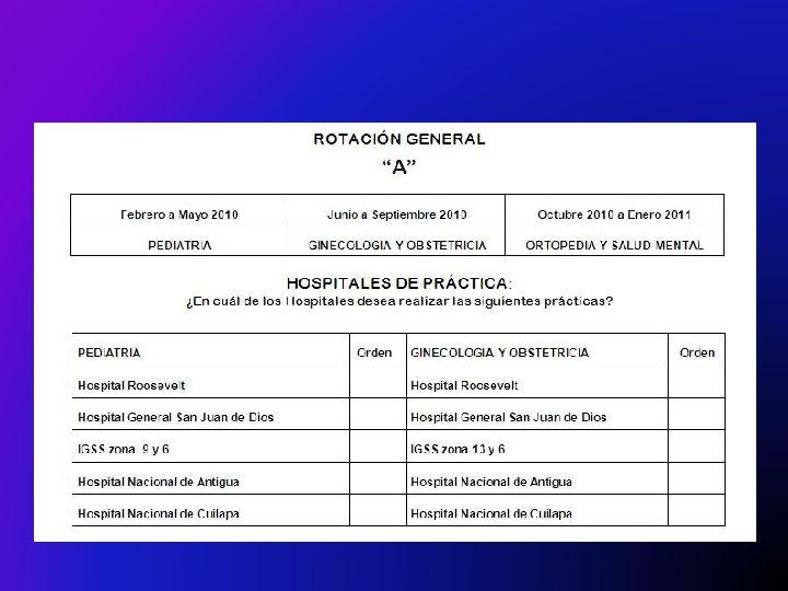 ¿Cómo se hará la distribución ? HOSPITAL TOTAL PARA 2010: ROTACION 2: FEB-MAYO 295 98 JUNIO-SEPT OCT-ENERO GINECO OBSTETRICIA ORTO/SM - ELECTIV PEDIATRIA GENERAL 20 20 ROOSEVELT 20 20 IGSS 32 32 ANTIGUA 18 19 CUILAPA 08 08 TOTAL 49 / 49 98 98 98