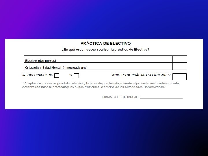 Observaciones Especiales • Quienes les corresponda ELECTIVO en febrero y marzo, tienen la primera semana de febrero para completar su papelería • Presentación a las áreas: – Hospitalarias: Lunes 1 de febrero 7: 00 AM. – Salud Mental , Lunes 1 de febrero a las 8: 00 horas en el CUM NO SE ACEPTAN CAMBIOS EN LA ROTACION