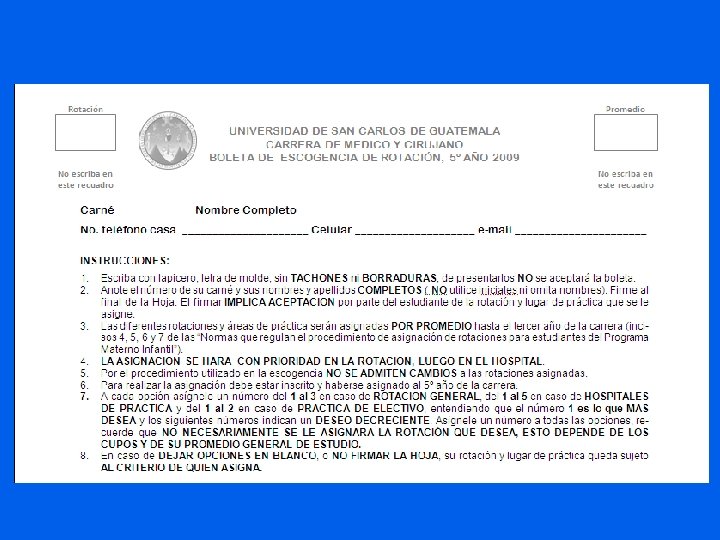 • Se dará información de cómo llenar la boleta. • Entrega de la boleta de escogencia por promedio, . (Art. 28). • Se escoge a viva voz la ROTACION • Llenarla sin tachones o borraduras. • Una vez llenada, se entrega de nuevo por orden de promedio • No se aceptarán boletas que no estén COMPLETAMENTE LLENAS Y FIRMADAS