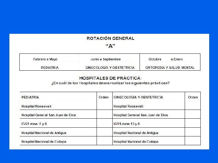 ¿Cómo se hará la distribución ? HOSPITAL TOTAL PARA 2012: ROTACION B: FEB-MAYO 379 126 JUNIO-SEPT OCT-ENERO GINECO OBSTETRICIA ORTO/SM - ELECTIV PEDIATRIA GENERAL 27 27 ROOSEVELT 27 27 IGSS 38 38 ANTIGUA 26 26 CUILAPA 08 08 TOTAL 63 / 63 126 126