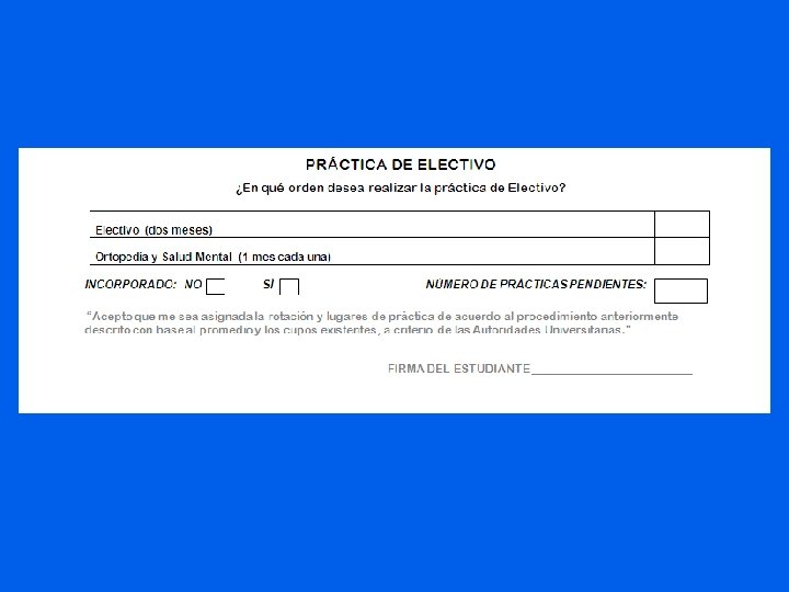 Observaciones Especiales • Quienes les corresponda ELECTIVO en febrero y marzo, tienen la primera semana de febrero para completar su papelería • Presentación a las áreas: – Hospitalarias: Miércoles 1 de febrero 7: 00 AM. – Salud Mental , Miércoles 1 de febrero a las 8: 00 horas en el Hospital NO SE ACEPTAN CAMBIOS EN LA ROTACION
