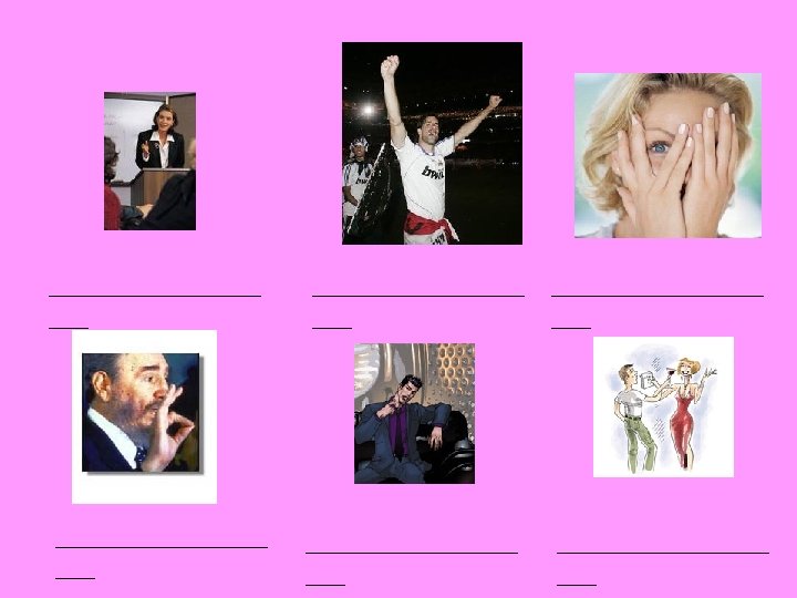 Aplica: Clasifica las siguientes imágenes, según los cinco tipos de gestos revisados: • • • emblemáticos o emblemas ilustrativos o ilustradores que expresan estados emotivos o patógrafos reguladores de la interacción gestos de adaptación o adaptadores