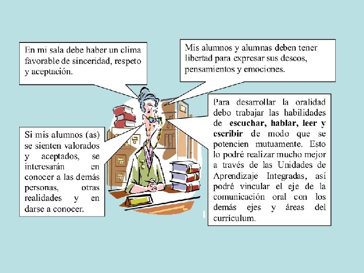 Yo, el alumno soy el verdadero actor de la clase y más todavía cuando se está desarrollando la expresión oral, sólo así podré aprender, porque mi profesor o profesora podrá escucharme y podrá decirme si lo estoy haciendo bien, si lo estoy haciendo mejor que antes o me corregirá si es necesario.