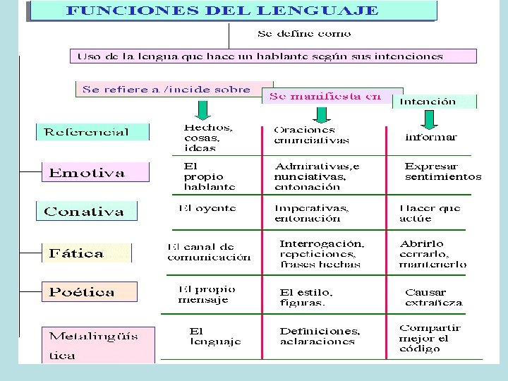 Primera distinción: En el lenguaje Funciones Al servicio de la comprensión y la expresión (orientadas al conocimiento de las funciones y relaciones morfosintácticas de una lengua. Por ejemplo: gramática). Del lenguaje (orientadas a la comprensión de las intenciones o actitudes de los hablantes de una lengua. Asociadas al propósito. Por ejemplo: dar órdenes, explicar, pedir, expresar dudas, etc. ).