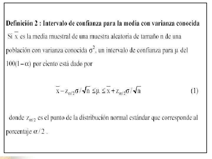 Intervalo de confianza para la media poblacional A) Si la varianza poblacional ( 2) es conocida Para todo tamaño de muestra de población normal o Para muestra grande (n 30) de cualquier población donde Z 1 - es la cuantila 1 - de la normal estándar
