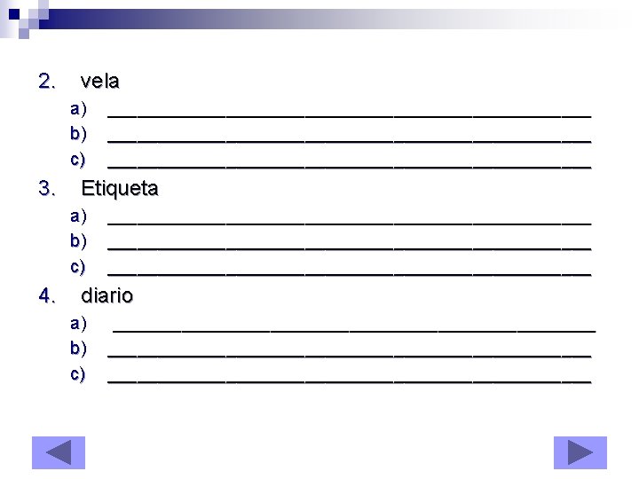 3. 4. 5. Cuando escribimos, debemos dejar un margen a los vendedores. a) extremidad, orilla b) blanco alrededor de una página Los alpinistas lograron llegar hasta el pico de la montaña. a) Boca b) cúspide El ave agarró a su presa con su pico. a) Mandíbula b) punta