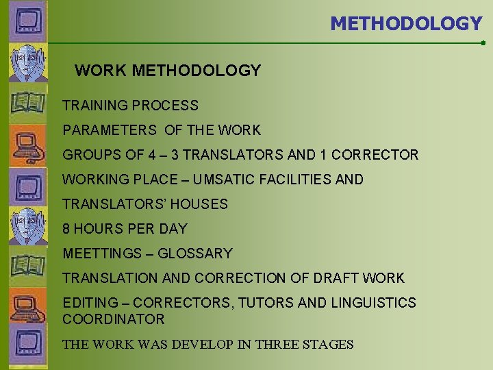 METHODOLOGY WORK METHODOLOGY TRAINING PROCESS PARAMETERS OF THE WORK GROUPS OF 4 – 3 TRANSLATORS AND 1 CORRECTOR WORKING PLACE – UMSATIC FACILITIES AND TRANSLATORS’ HOUSES 8 HOURS PER DAY MEETTINGS – GLOSSARY TRANSLATION AND CORRECTION OF DRAFT WORK EDITING – CORRECTORS, TUTORS AND LINGUISTICS COORDINATOR THE WORK WAS DEVELOP IN THREE STAGES