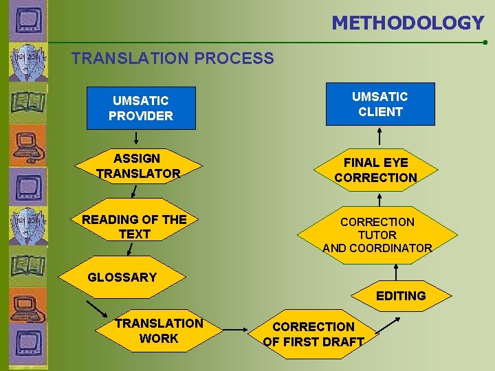 METHODOLOGY TRANSLATION PROCESS UMSATIC PROVIDER ASSIGN TRANSLATOR READING OF THE TEXT UMSATIC CLIENT FINAL EYE CORRECTION TUTOR AND COORDINATOR GLOSSARY EDITING TRANSLATION WORK CORRECTION OF FIRST DRAFT