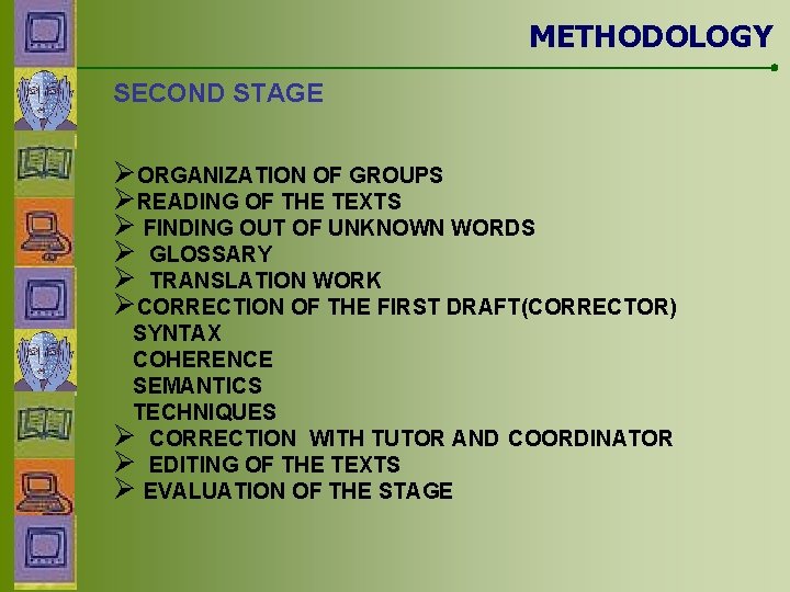METHODOLOGY FIRST STAGE Ø ORGANIZATION OF GROUPS(4 PARTICIPANTS) ØREADING OF THE TEXTS Ø FINDING OUT OF UNKNOWN WORDS Ø GLOSSARY Ø TRANSLATION WORK ØCORRECTION OF THE FIRST DRAFT(CORRECTOR) SYNTAX COHERENCE SEMANTICS TECHNIQUES Ø CORRECTION WITH TUTOR AND COORDINATOR Ø EDITING OF THE TEXTS Ø EVALUATION OF THE STAGE