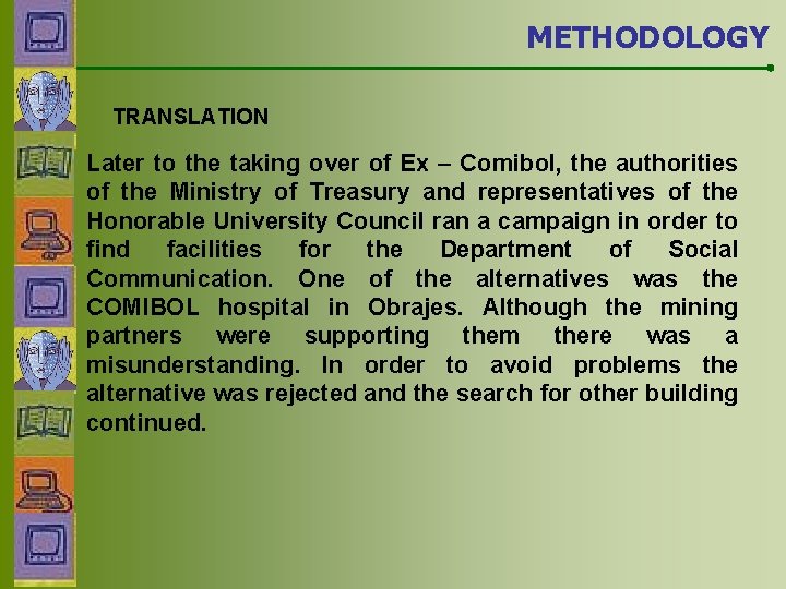 METHODOLOGY SECOND STAGE EXAMPLES OF THE TRANSLATION PROBLEMS FOUND DURING THE WORK TEXTO ORIGINAL EN ESPAÑOL: Posterior a la toma de Ex Comibol las autoridades del Ministerio de Hacienda y representantes del Honorable Consejo Universitario se habían puesto en campaña con el objetivo de conseguir predios para la carrera de Comunicación Social. Una de las alternativas era en la zona de Obrajes en la Clínica de COMIBOL. A pesar de que los compañeros mineros nos estaban apoyando hubo cierto mal entendido en sentido de que la Carrera se iba a apoderarse de esos espacios. Para evitar esa situación se dejó de lado esa posibilidad y se continuó con la búsqueda de otro predio.