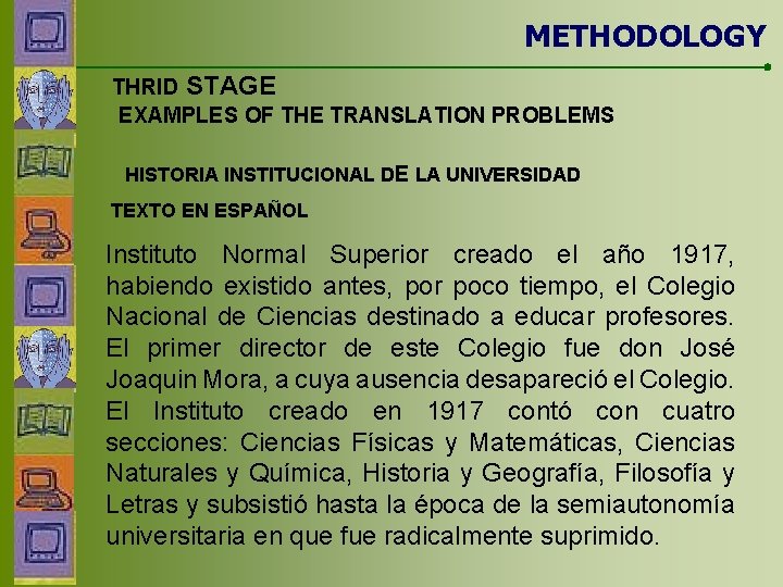 METHODOLOGY THRID STAGE EXAMPLES OF THE TRANSLATION PROBLEMS HISTORIA INSTITUCIONAL DE LA UNIVERSIDAD TEXTO EN ESPAÑOL Instituto Normal Superior creado el año 1917, habiendo existido antes, por poco tiempo, el Colegio Nacional de Ciencias destinado a educar profesores. El primer director de este Colegio fue don José Joaquin Mora, a cuya ausencia desapareció el Colegio. El Instituto creado en 1917 contó con cuatro secciones: Ciencias Físicas y Matemáticas, Ciencias Naturales y Química, Historia y Geografía, Filosofía y Letras y subsistió hasta la época de la semiautonomía universitaria en que fue radicalmente suprimido.