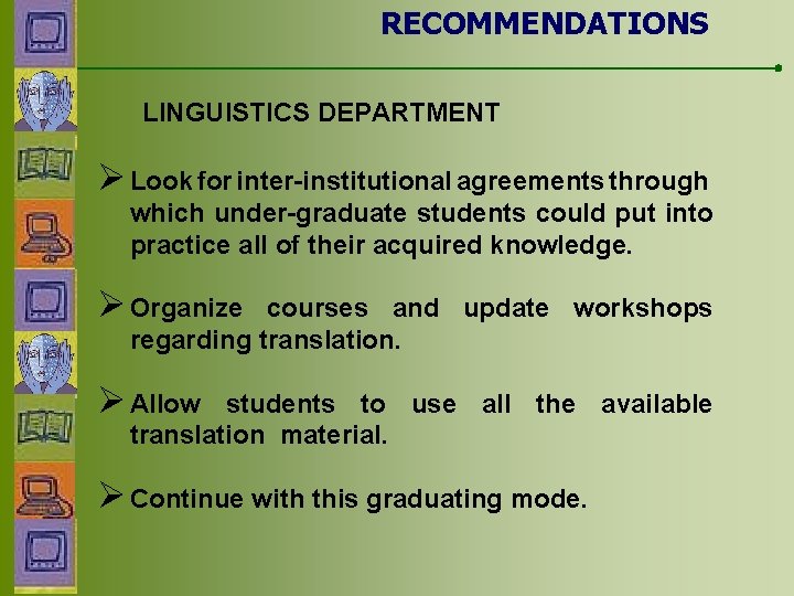 RECOMMENDATIONS LINGUISTICS DEPARTMENT Ø Look for inter-institutional agreements through which under-graduate students could put into practice all of their acquired knowledge. Ø Organize courses and update workshops regarding translation. Ø Allow students to use all the available translation material. Ø Continue with this graduating mode.
