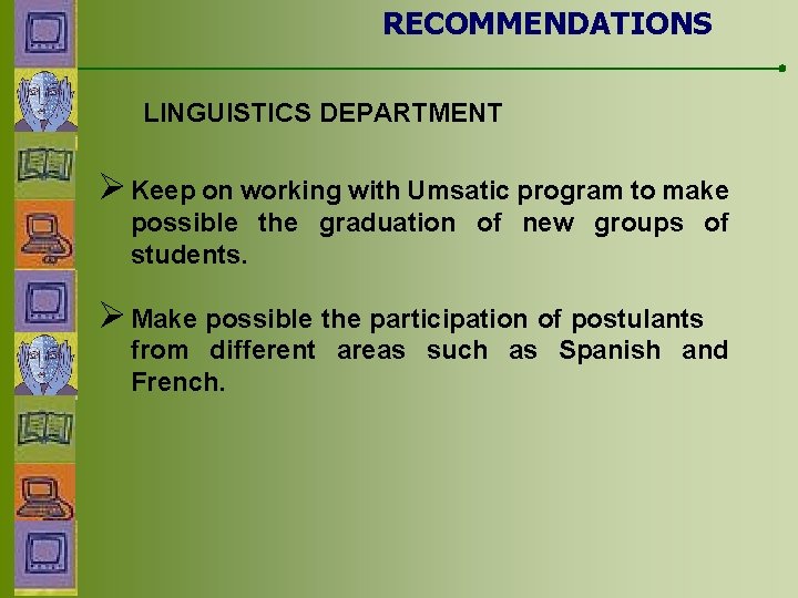 RECOMMENDATIONS LINGUISTICS DEPARTMENT Ø Keep on working with Umsatic program to make possible the graduation of new groups of students. Ø Make possible the participation of postulants from different areas such as Spanish and French.
