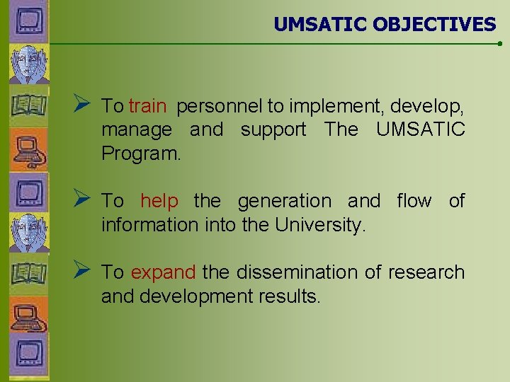 UMSATIC OBJECTIVES Ø To train personnel to implement, develop, manage and support The UMSATIC Program. Ø To help the generation and flow of information into the University. Ø To expand the dissemination of research and development results.