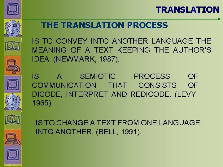 TRANSLATION THE TRANSLATION PROCESS IS TO CONVEY INTO ANOTHER LANGUAGE THE MEANING OF A TEXT KEEPING THE AUTHOR’S IDEA. (NEWMARK, 1987). IS A SEMIOTIC PROCESS OF COMMUNICATION THAT CONSISTS OF DICODE, INTERPRET AND REDICODE. (LEVY, 1965). IS TO CHANGE A TEXT FROM ONE LANGUAGE INTO ANOTHER. (BELL, 1991).