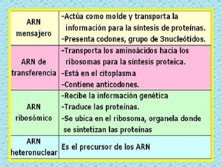 • ARN Es un ácido nucleico formado por una cadena de ribonucleótidos. • Dirige las etapas intermedias de la síntesis proteica.