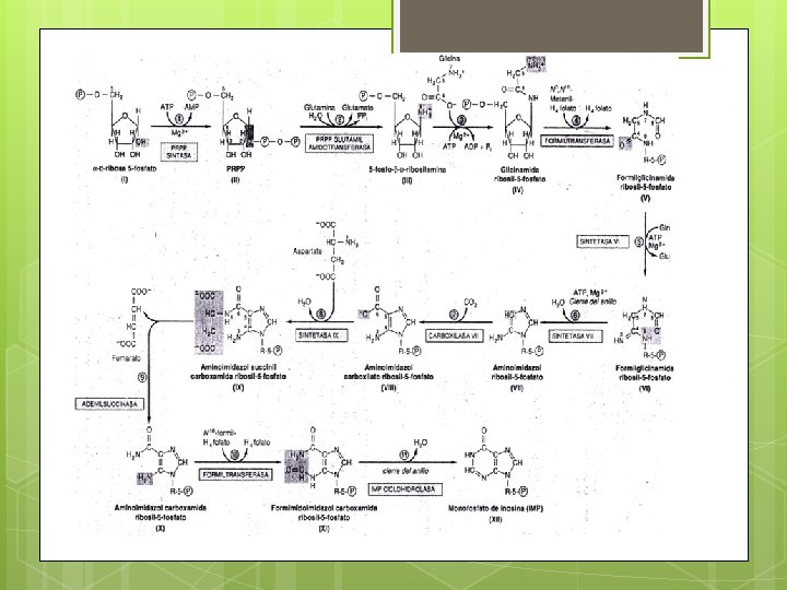 7. 1. BIOSÍNTESIS DE PURINAS En el sistema de anillo en crecimiento se enlaza con la ribosa fosfato mientras se está formando la cadena de carbono de la purina, primero se forma la de anillo de cinco miembros y después el de seis y al final se produce inosina-5 -monosfosfato La conversión de IMP a AMP tiene lugar en dos etapas . La primera es la reacción del aspartato con IMP para formar adenil succinato. La conversión de IMP a GMP también tiene lugar en dos etapas. El primero de los dos pasos es una oxidación, donde el grupo C-H en posición C-2 se convierte en un grupo cetonico. El nucleótidos monofosfatos, disfosfatos y trifosfatos de purina constituyen inhibidores de retroalimentación en las primeras etapas, de su propia biosíntesis.