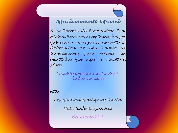 REFERENCIAS BIBLIOGRÁFICAS Tortora-Derrickson; Principios de Anatomía y Fisiología; 11 a edición. Editorial Medica Panamericana, 2006 España, pág. 54 Química 4 secundaria. Víctor Hugo Cortez Aranda. Editorial Don Bosco. La Paz- Bolivia. Biología 3. Sonia Camacho y Carmen Cuellar. Editorial La Hoguera. Rolando Álvarez – Química Orgánica Básica tomo 4. Cochabamba- Bolivia es. wikipedia. org/wiki/Ácido_nucléico Ángel Gil Hernández Fermín Sánchez de Medina Contreras; Capítulo 1. 2. Funciones y metabolismo de los nutrientes BIOQUÍMICA-1º de Medicina. Departamento de Biología Molecular; M. Dolores Delgado. TEMA 15. Introducción al metabolismo y bioenergética. Josefina Bálsamo. Biología 4 secundaria. Editorial El Pauro. Pág. 114 http: //lopezalexia 18. blogspot. com/2013/05/metabolismo-de-acidos -nucleicos. html http: //academic. uprm. edu/~jvelezg/labmoleculas. pdf Bioquímica de Harper. 28ªedición.