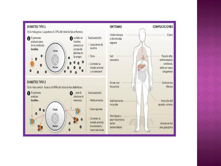 EXISTEN DOS TIPOS PRINCIPALES DE DIABETES: DIABETES DE TIPO 1 Puede ocurrir a cualquier edad, mas frecuente en niños, adolescentes o jóvenes. El cuerpo no produce poca insulina y se necesitan inyecciones diarias DIABETES DE TIPO 2 Corresponde a la mayoría de los casos de diabetes se presenta en edad adulta. Actualidad es mas frecuente en jóvenes debido a la alta tasa de obesidad