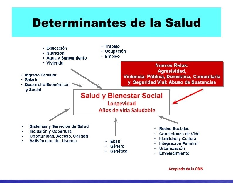 Componentes de la salud según la OMS 1. Estado de adaptación al medio: El estado de medio ambiente no es solo de naturaleza físico-química o biológica, sino que contempla los llamados factores socioculturales, que son aquellos creados por el hombre con un fin determinado. 2. Estado variable fisiológico de equilibrio y adaptación.